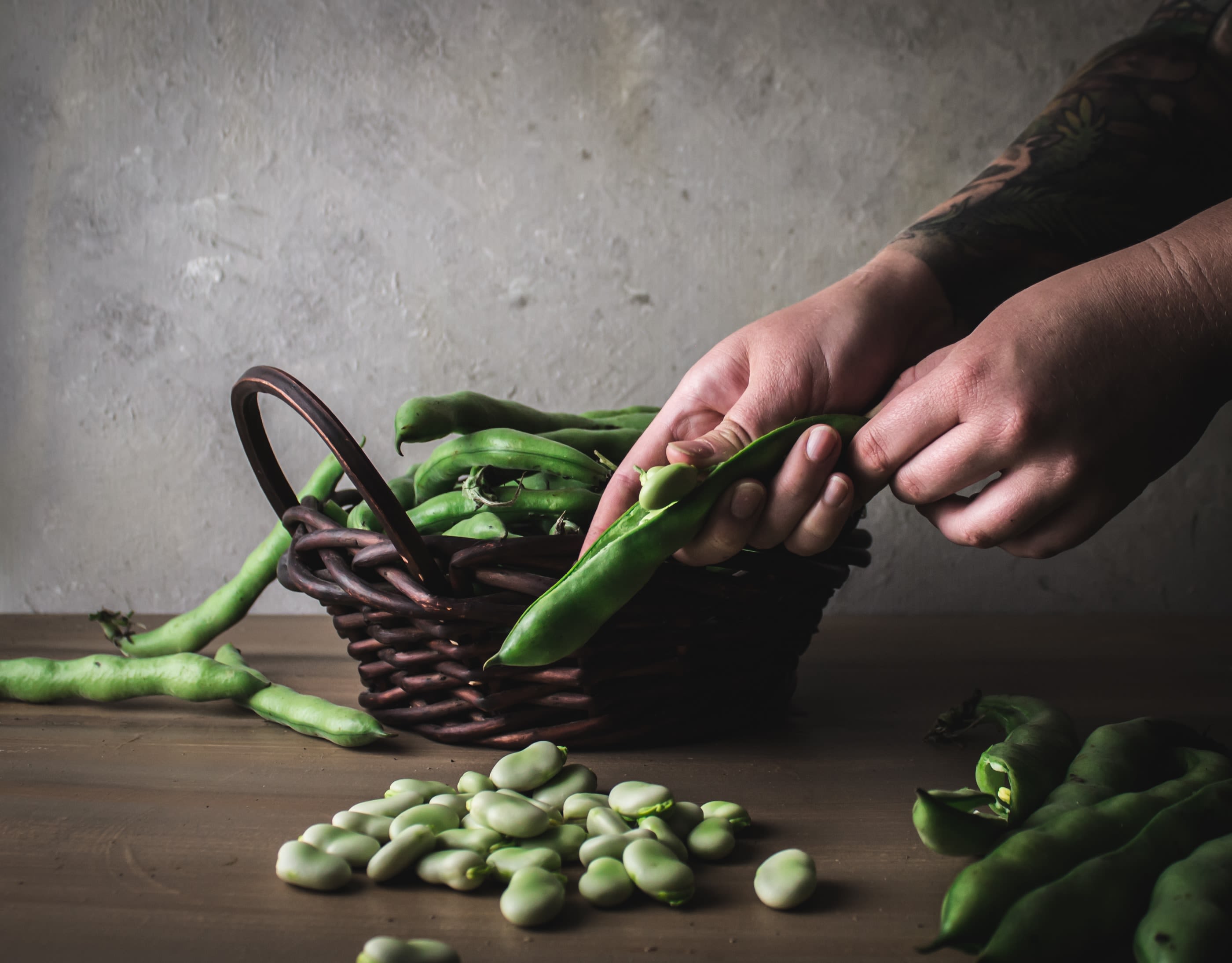 Engle, Q. (2020, January 24). Hands shelling fava beans from a basket on a rustic wood table [photograph]. Unsplash. https://unsplash.com/photos/eiMQLRvY8QQ